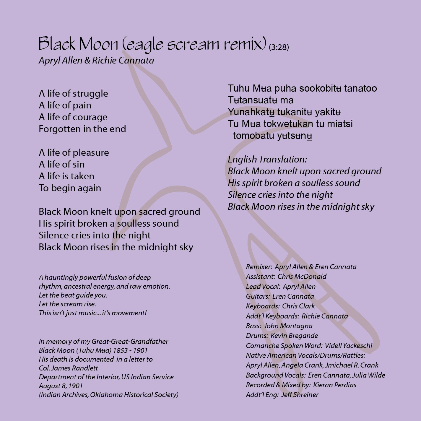 Black Moon (eagle scream remix) is more than just a dance mix— it’s ancestral power. It’s in honor of my great-great-grandfather. His struggle to fit in with 1901 society. With hard work and study, he surpassed the monetary means of most people. His story is resilient, deeply rooted, and hauntingly provocative. It’s about survival. It’s about a changed world. It’s about spirit . . . Remixed.
